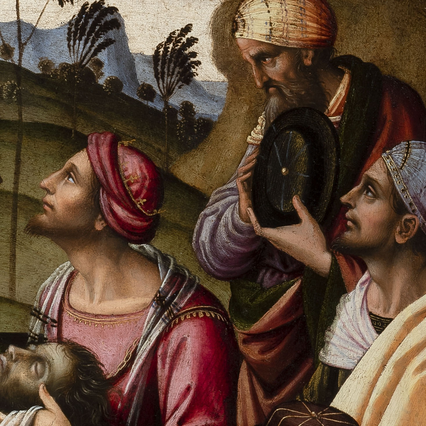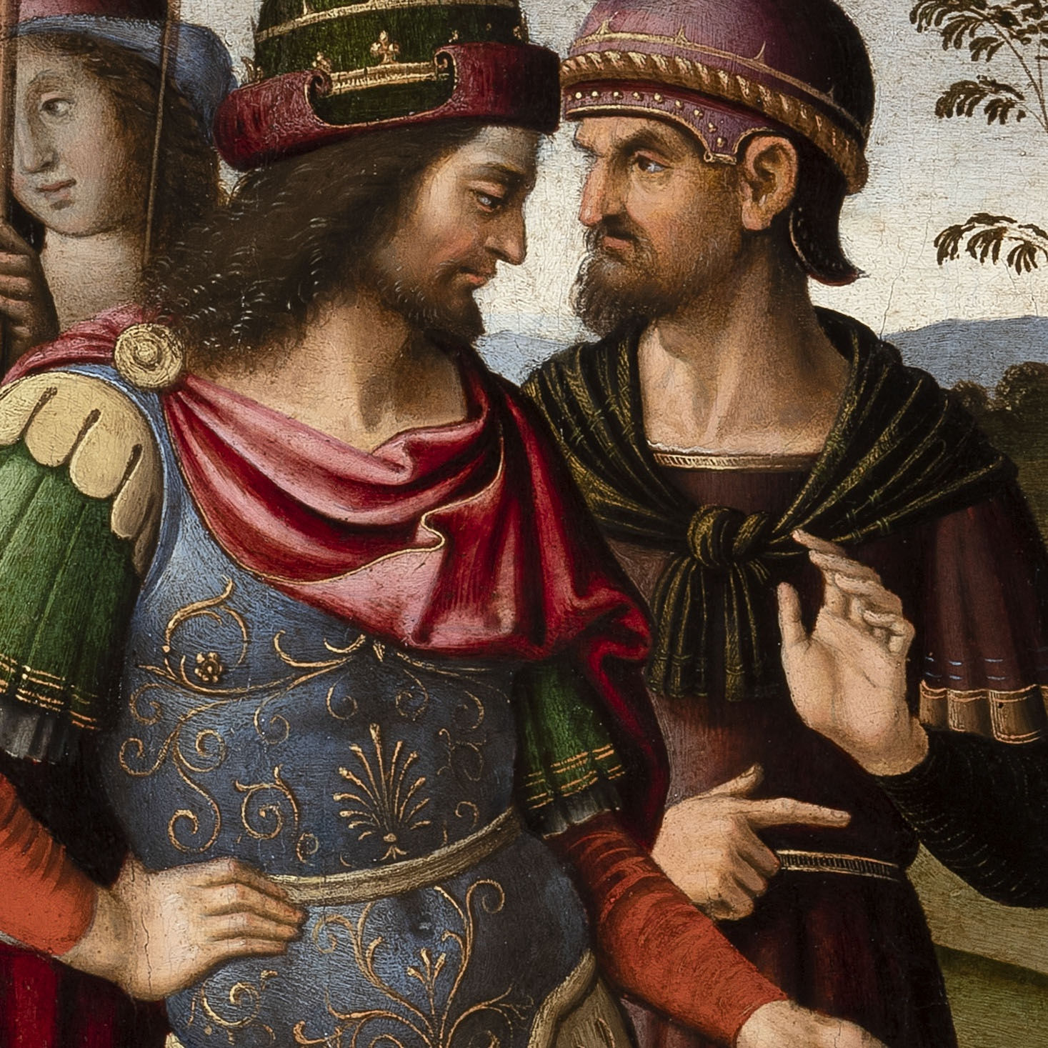 Databile intorno al 1495/1500, il dipinto è un desco eseguito probabilmente per commemorare un evento politico o diplomatico, come suggerito da Oskar Fischel nel catalogo della collezione parigina di Joseph Spiridon, a cui l’opera è appartenuta in passato. Ipotesi che trova conferma nel soggetto rappresentato, descritto da Plutarco nella Vita di Pompeo (LXXXVII) relativo alle vicende della guerra civile romana che vide Cesare contro Pompeo (49-45 a. C.).