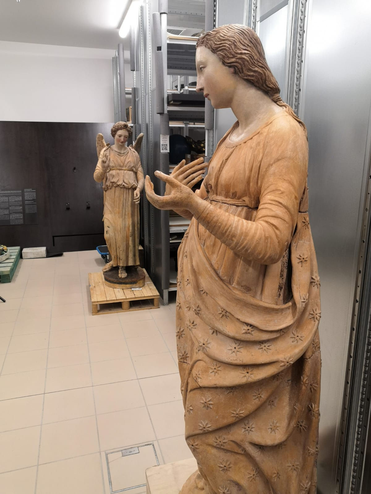 La Vergine, grande poco più del naturale, con il suo manto disseminato di stelle a otto punte recante ancora tracce di doratura e cromia originali, è certamente una delle nostre scoperte più avvincenti. Variamente attribuita a Agostino di Duccio e Matteo Civitali, il legame col suo pendant a Budapest e al nome del suo autore si è nel tempo affievolito, fino quasi a cancellarsi. È grazie alle ricerche e gli studi di Gabriele Fattorini, Giancarlo Gentilini e Lorenzo Principi se l'opera è stata correttamente ricondotta al genio dello scultore senese e messa nuovamente in relazione al suo bellissimo Angelo.